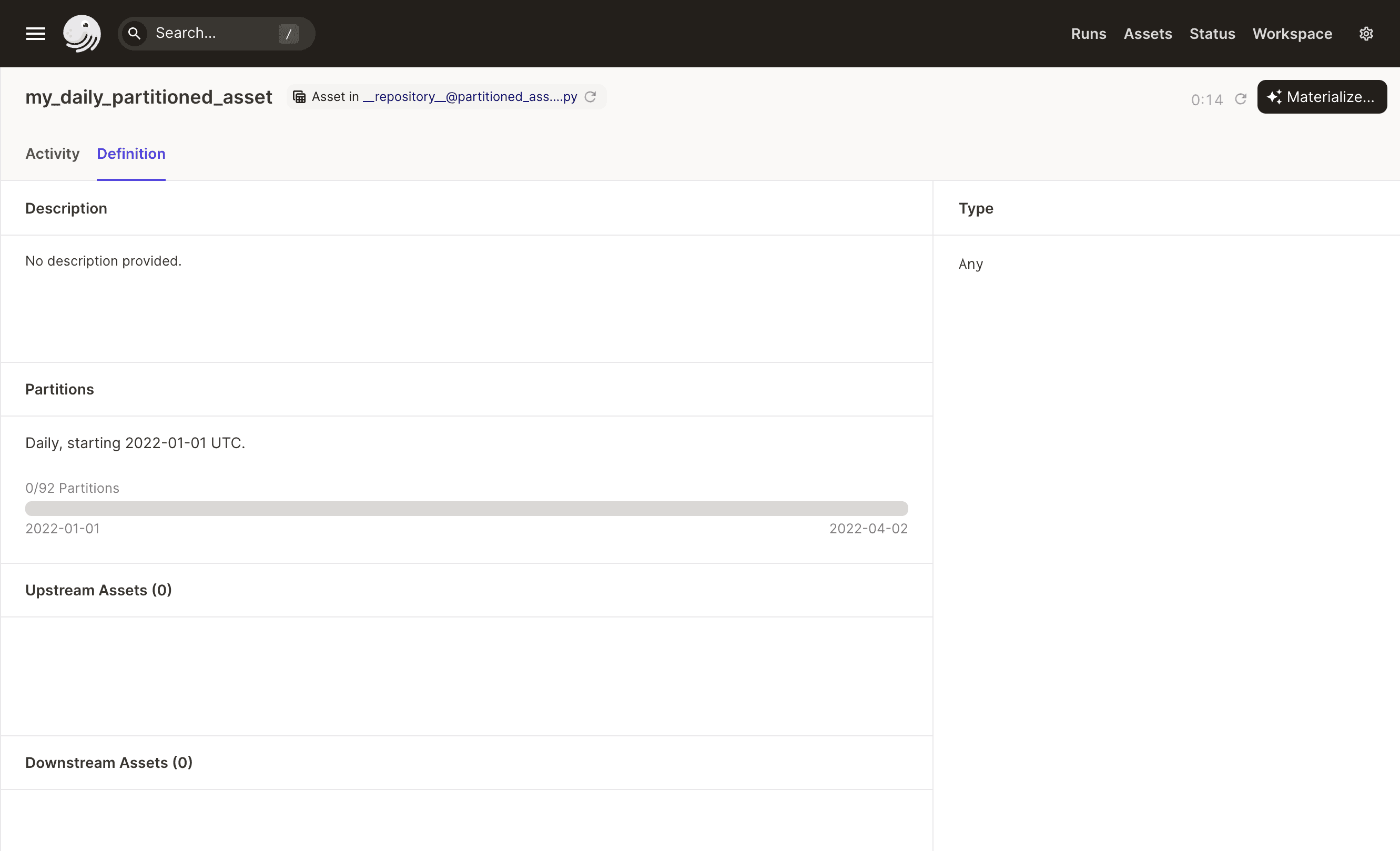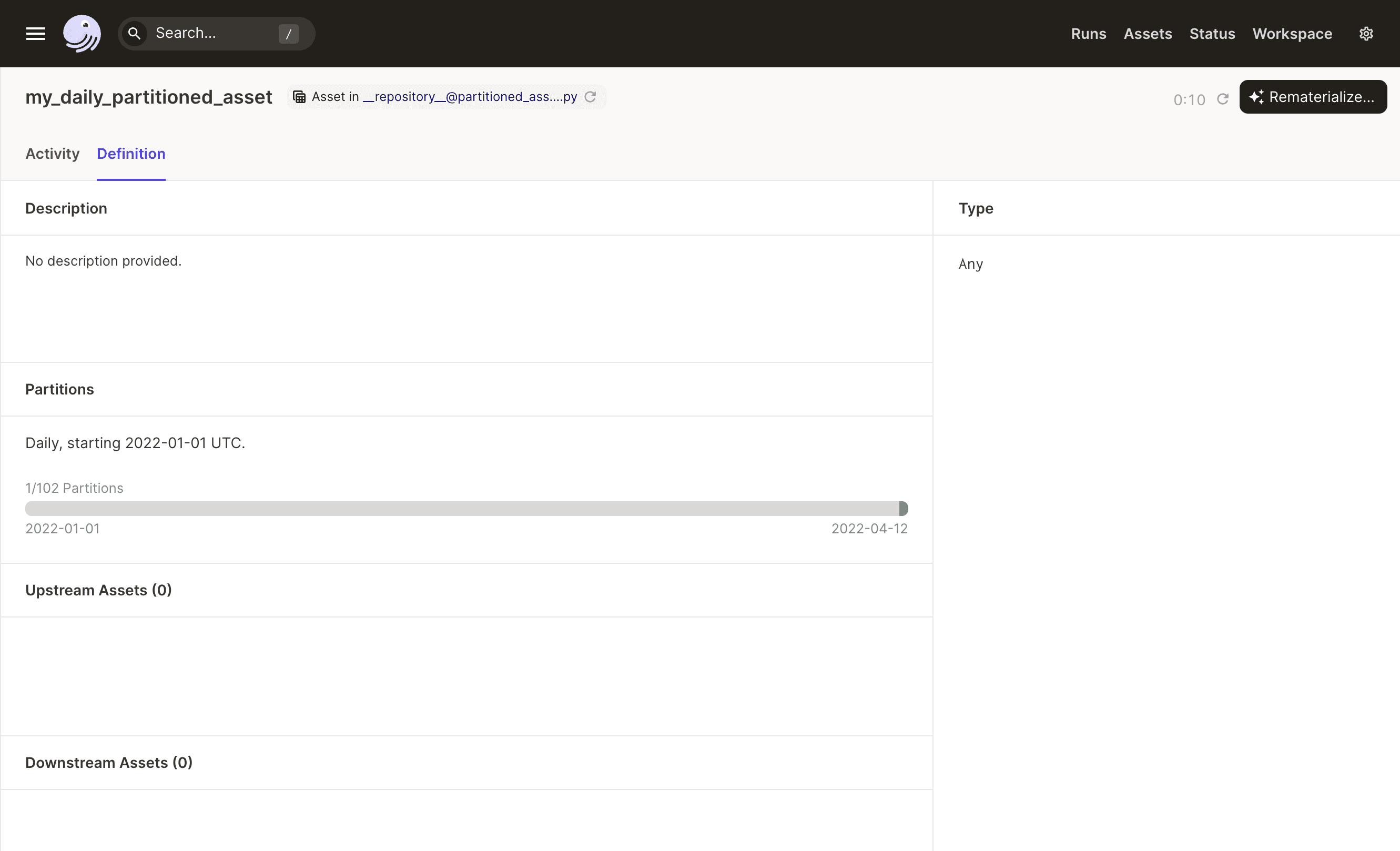 To view all partitions for an asset, open the Definition tab of the asset's details page. The bar in the Partitions section represents all of the partitions for the asset.